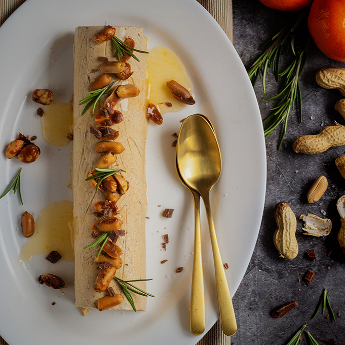 Im Bild mit dem Zimtparfait liegt das Eis selbst auf der Linie und auch die markante Linie des Tischsets liegt auf einer Linie.