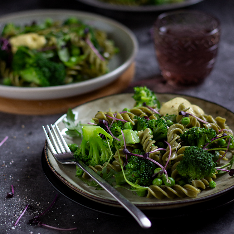 Hier gibt es einen leckeren Nudelsalat mit allerlei Grün und vielen Vitaminen. Dazu schmeckt ein Curryrahm-Dip ganz wunderbar, den ihr übrigens ganz einfach ganz im Sinne des Veganuary veganisieren könnt, indem ihr statt dem Milchprodukt als Basis Hummus verwendet.