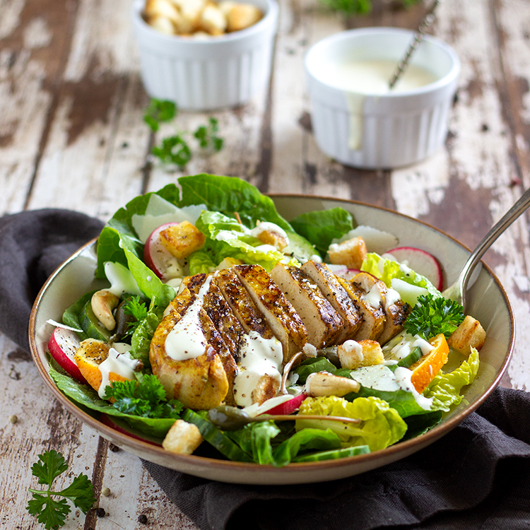 Caesars Salad ist eine international bekannte Salatkreation. Auf dem knackigen Romanasalat, einer Sorte des grünen Gartensalats, wird im Original Hühnerbrustfilet gebettet. Croutons sind ebenso unverzichtbar wie das sämige Dressing – es wird ähnlich wie Mayonnaise cremig aufgeschlagen und beinhaltet neben Parmesan im Originalrezept auch Sardellen. In meinem Rezept gibt es ein Dressing auf Basis meiner veganen Aioli, angerührt auf leichte Art mit Joghurt und einem Hauch Orange – sehr sommerlich fruchtig. Anstelle des Hähnchens tritt bei mir Filet von Green Mountain.
