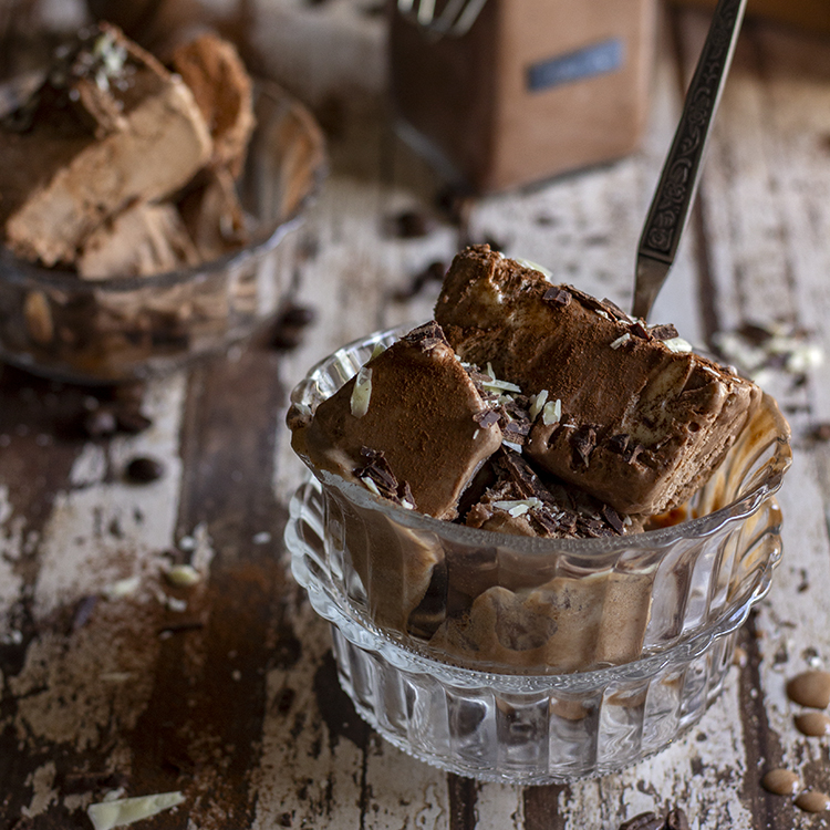 Sowohl die damalige Eismaschine als auch mein heutiges Equipment hat nichts mit einer professionellen guten Eismaschine zu tun. Deshalb mache ich mein Eis am Liebsten in Blockform, denn das funktioniert eben auch ohne ständig rührende Eismaschine und sämtlichen speziellen Zutaten wie Inulin, Guarkernmehl & Co. Das Semifreddo lässt sich zwar nicht in Kugeln herausstechen, aber sehr gut in Stücken servieren – und es schmeckt unglaublich gut!