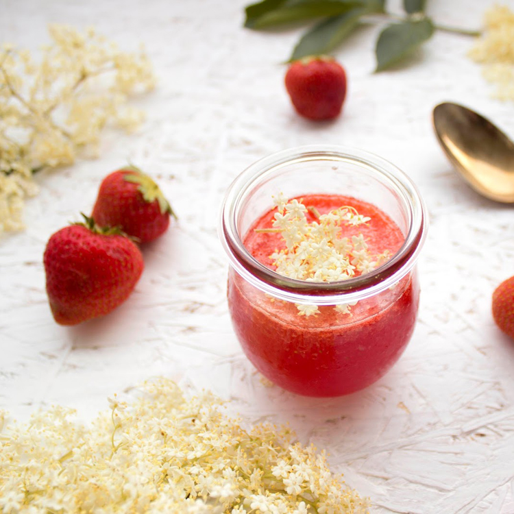 Dass Erdbeeren und Prosecco sich ganz wunderbar verstehen, ist spätestens seit der Erdbeerbowle oder anderen erfrischenden Erdbeercocktails kein Geheimnis. mehr. In einem Gläschen frisch eingekochter Erdbeermarmelade hat ein Schuss sprudelnder Prosecco ebenso Platz wie im Cocktailglas. Da auch die Hollundersaison bereits begonnen hat, sorgen ein paar duftende Blüten für das I-Tüpfelchen.