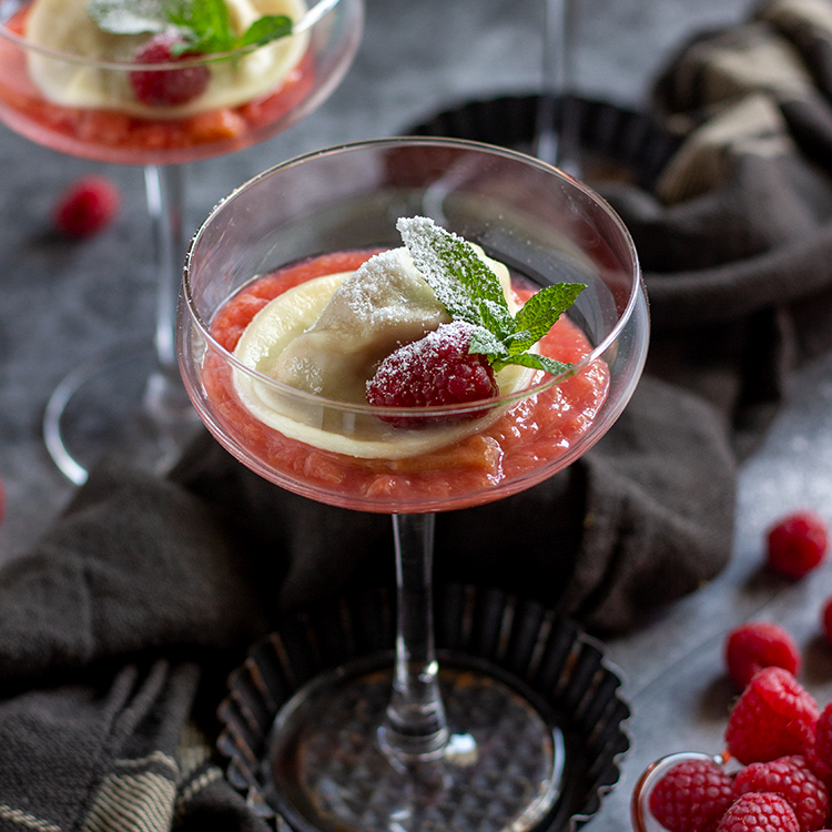 Kärntner Himbeernudel auf Rhabarber-Kompott
